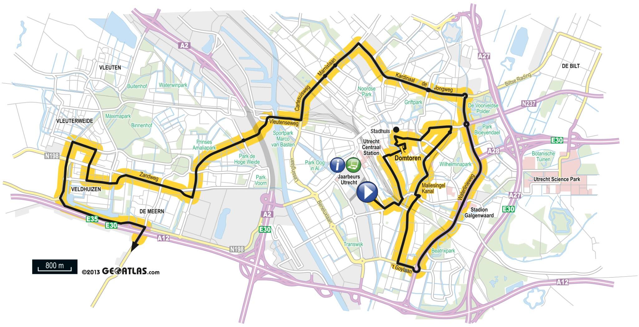 Dat blijkt uit het routeschema dat de tourdirectie vanochtend vrijgaf. De proloog -op 4 juli 2015- voert nog wel een stukje richting Heuvelrug, maar keert al bij de Uithof om richting stad. De tweede etappe doet eerst een rondje stad, inclusief de Dompoort en Leidsche Rijn. De karavaan verlaat vervolgens de stad via een viaduct onder de A12, om langs Achthoven en de Hollandsche IJssel verder richting Montfoort te fietsen.